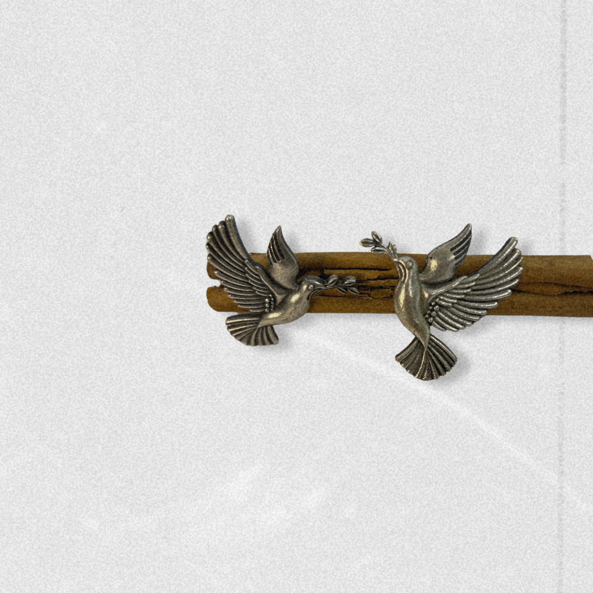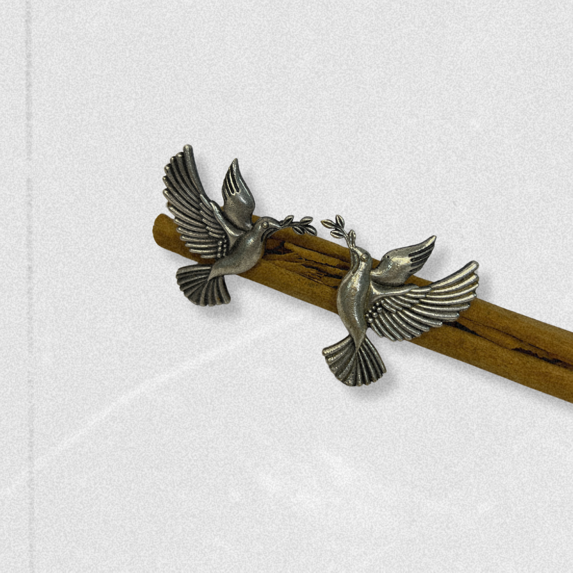 These oxidized metal earrings are shaped like doves in mid-flight, each carrying a small olive branch—an eternal symbol of peace, hope, and love. With a minimalist yet meaningful design, they carry a poetic charm ideal for everyday wear or gifting.
