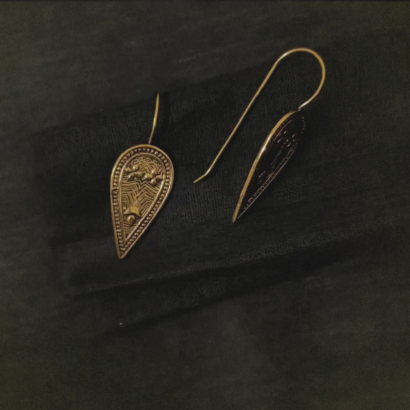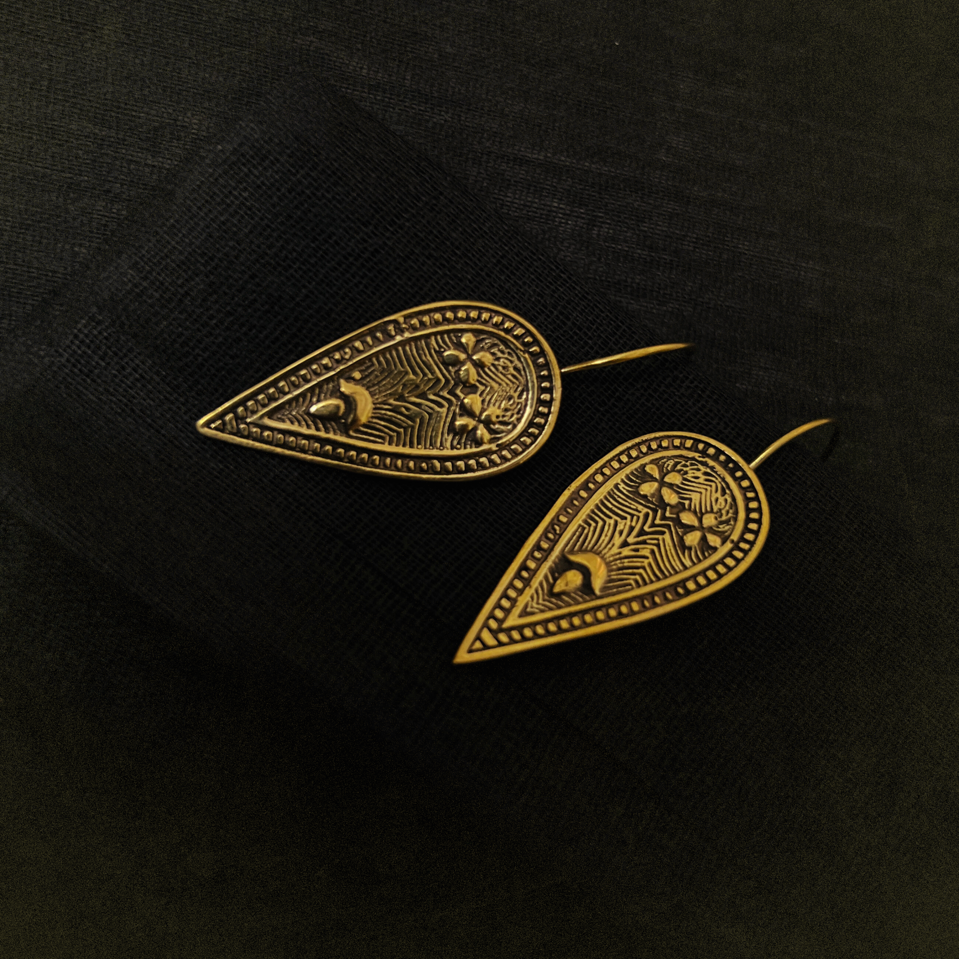 A delicate teardrop silhouette adorned with tribal motifs and dotted textures, these gold-toned brass earrings strike the perfect balance between tradition and modernity. Lightweight and versatile, they’re your go-to pair for everyday grace or festive charm.