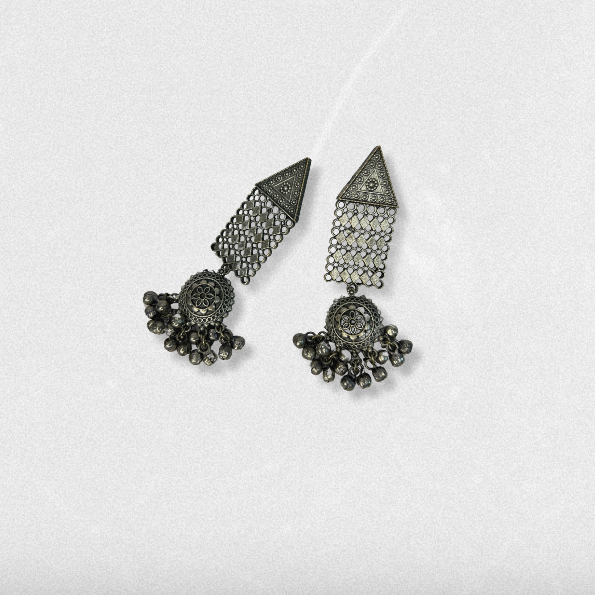 Inspired by the grandeur of ancient Rajasthani havelis, these oxidized earrings boast an architectural silhouette with intricate jaali-style patterns. The cascading floral disc and ghunghroo cluster add drama and rhythm, making them a statement piece with artisanal soul.
