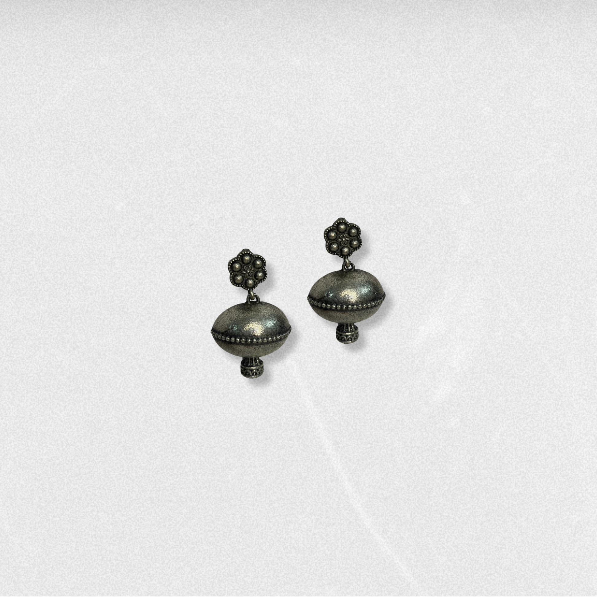 A tribute to earthy elegance, this pair of oxidised earrings draws inspiration from traditional Rajasthani domes and folk florals. The floral stud blooms with vintage charm, while the dome-shaped drop-temple bells and desert architecture. Perfect for when you want to keep it classic, grounded, and effortlessly regal.