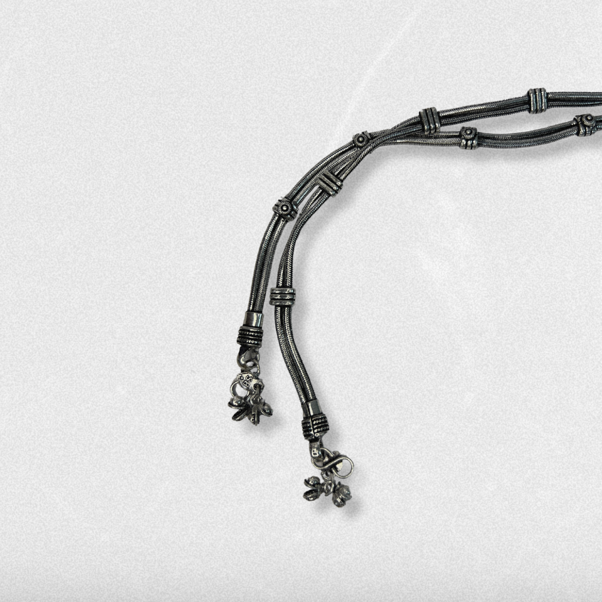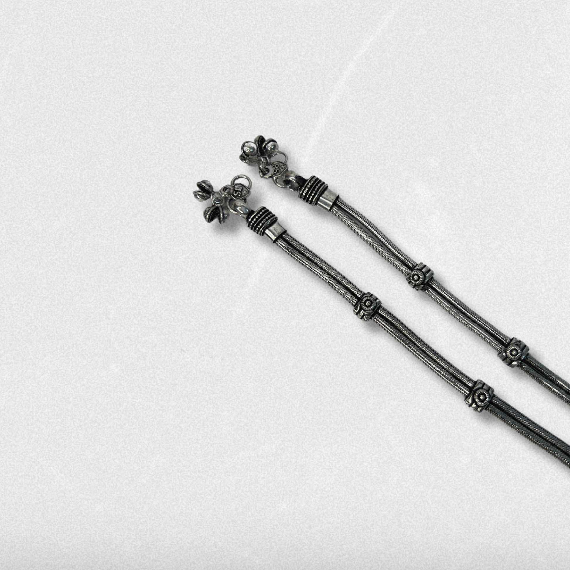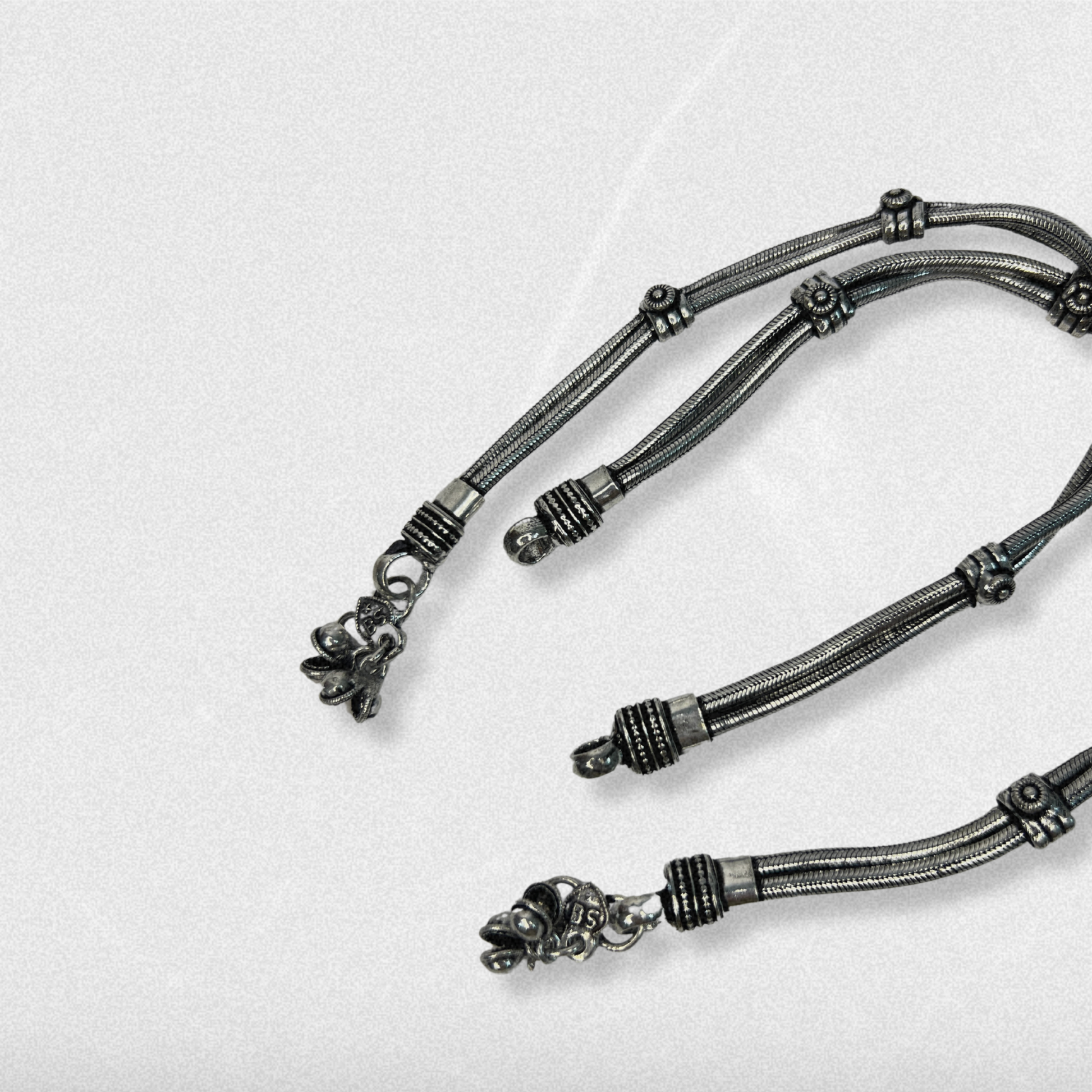 These bold, commanding, and unapologetically raw. With a robust pipe-style structure and floral ghungroo ends, it evokes the spirit of warrior queens and tribal strength. The oxidised finish gives it a grounding, earthy elegance fit for modern-day ranis.