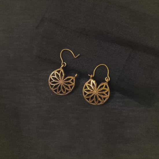Handcrafted brass floral drop earrings with a golden finish, inspired by blooming mandala motifs. These lightweight earrings are anti-tarnish, hypoallergenic, and non-allergic, making them perfect for everyday comfort or festive wear.