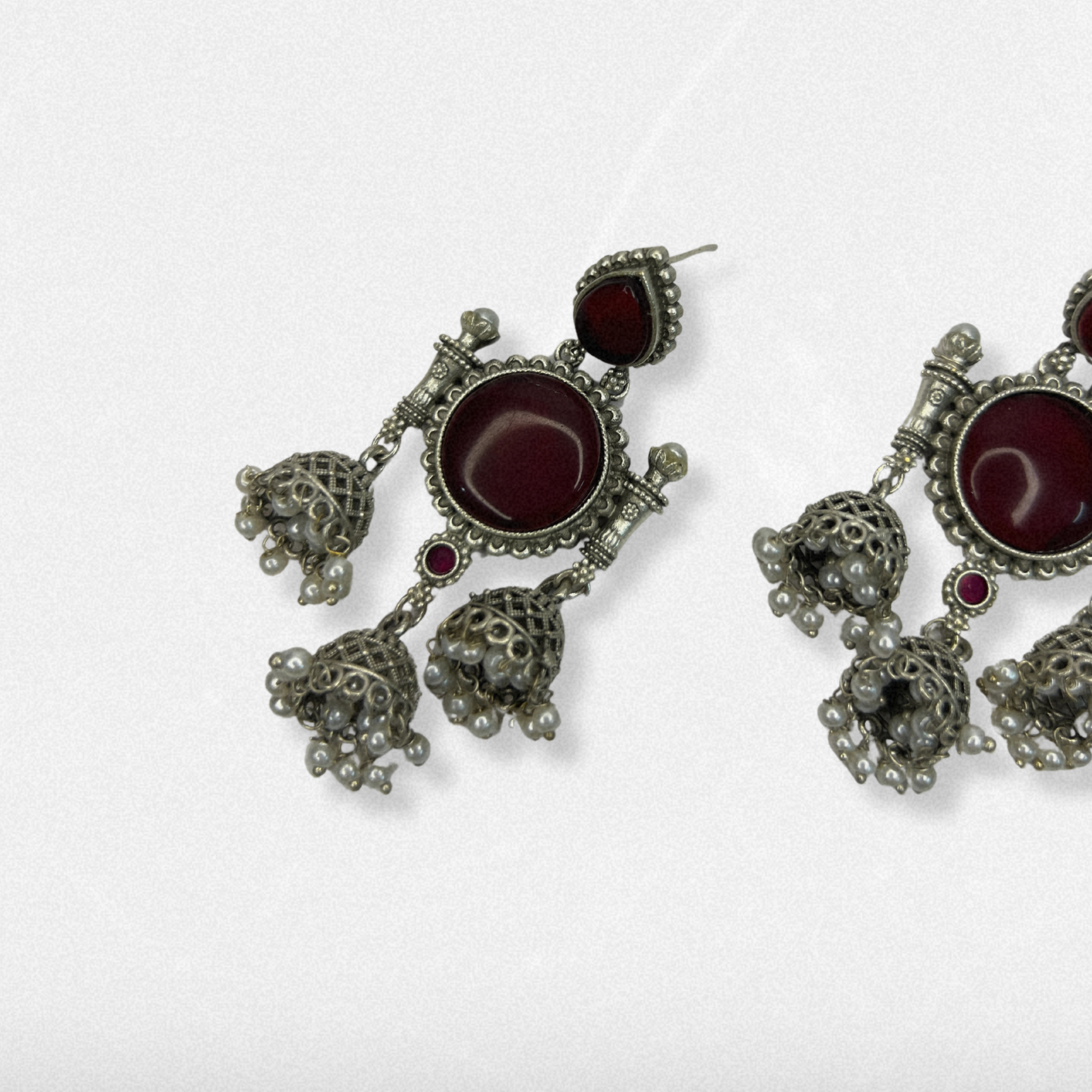 With teardrop and round maroon stones forming the central motif, these three-tiered oxidized jhumkas are a nod to classical Rajasthani design. Delicate dome-shaped ghunghroo hangings chime with every movement, while the ruby-like hues add richness and warmth.