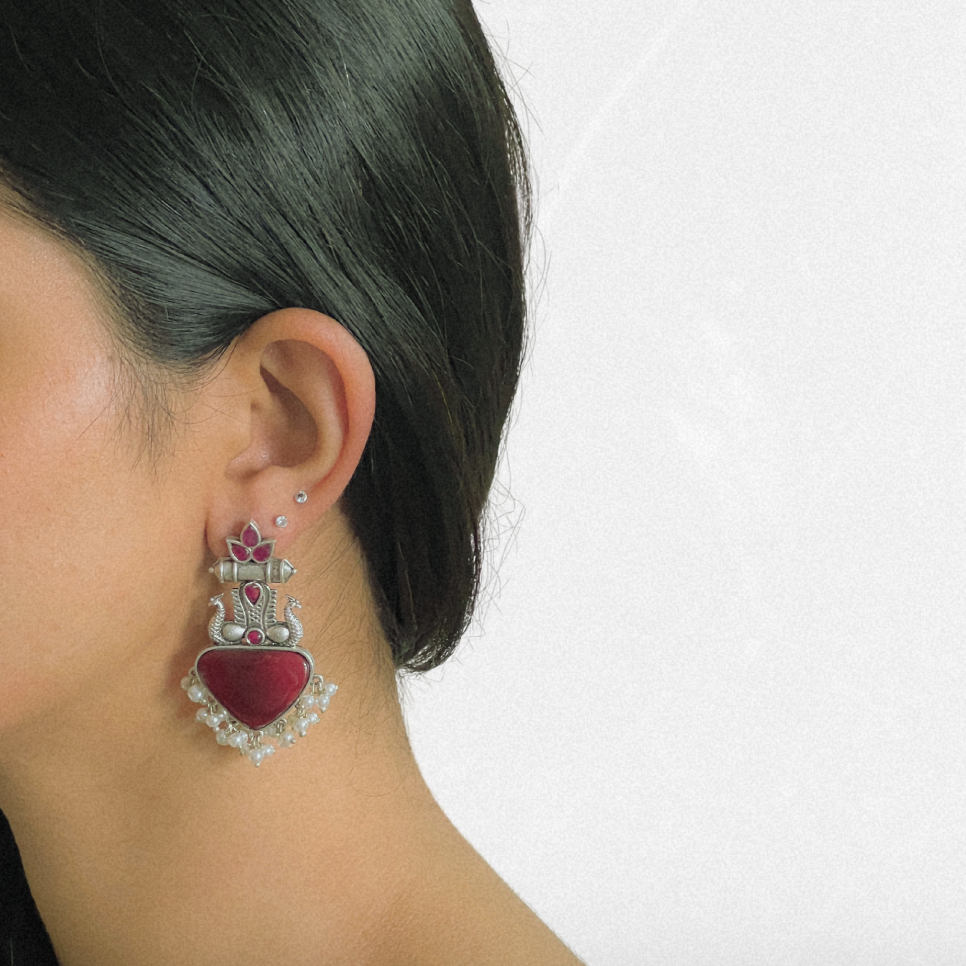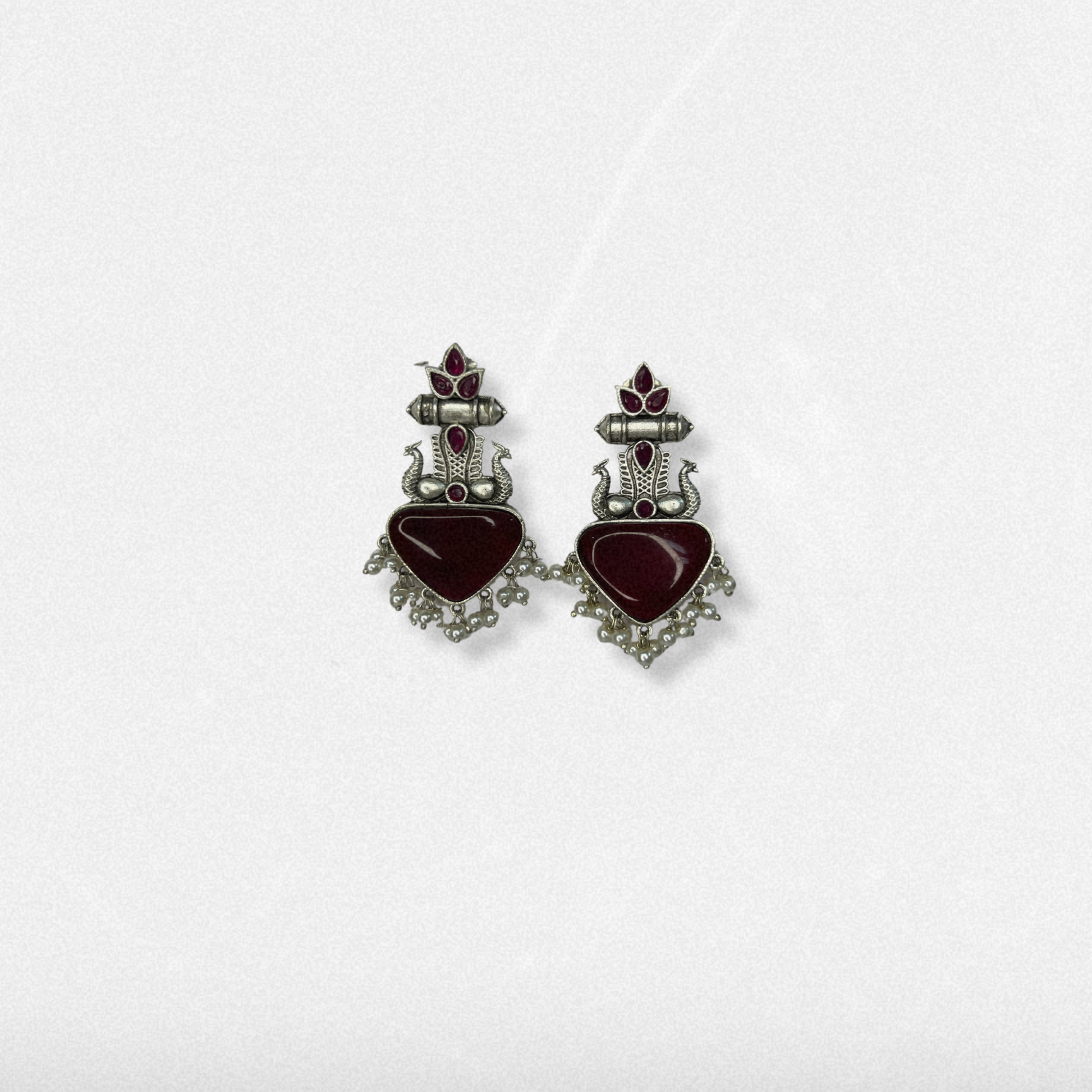 These oxidized rich red stone earrings are a regal tribute to temple iconography, featuring twin swans poised gracefully on either side of the central motif—symbols of purity, devotion, and divine femininity. Below them rests a deep maroon stone, shaped like a blossoming lotus bud, bordered by delicate pearl clusters.
