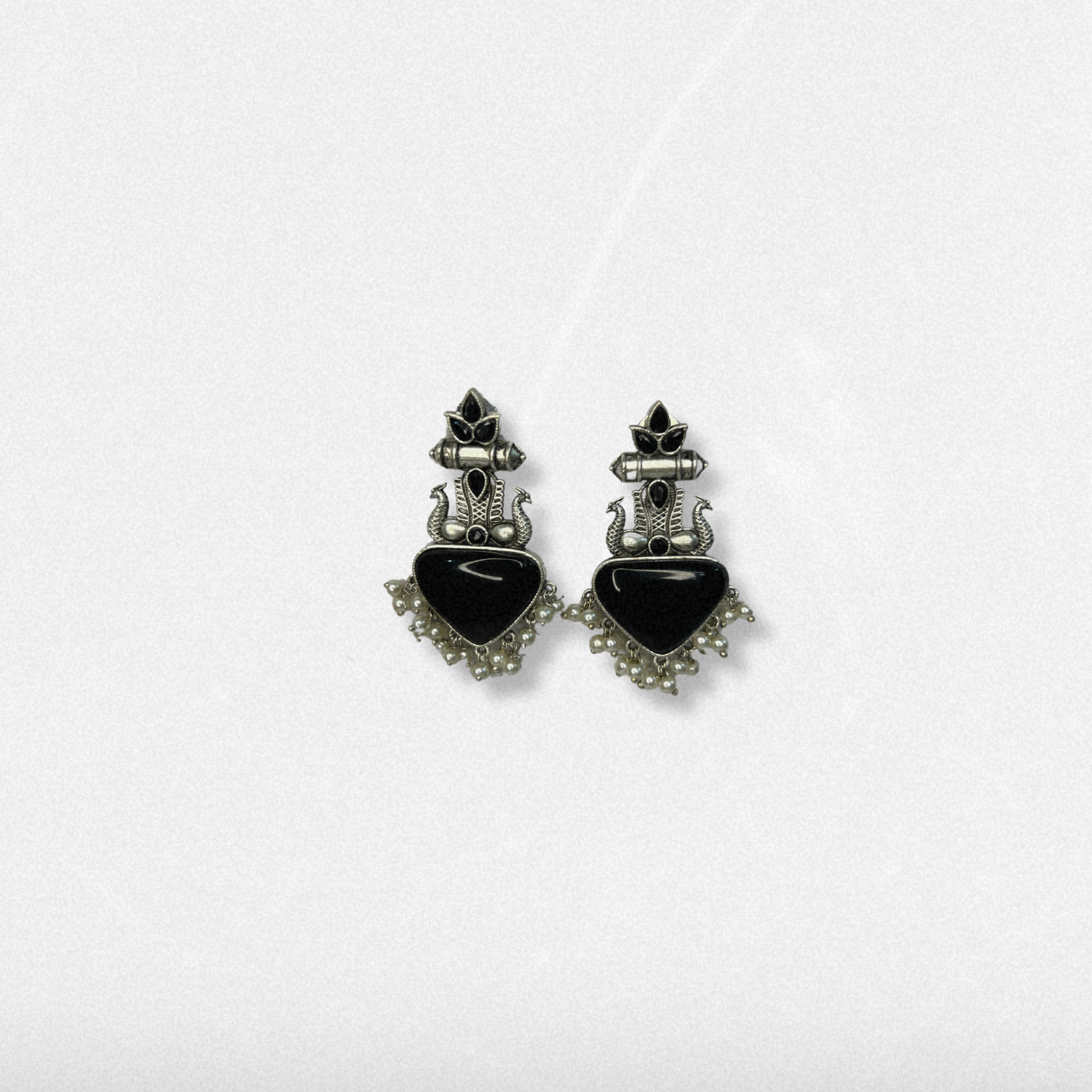 These oxidized rich black stone earrings are a regal tribute to temple iconography, featuring twin swans poised gracefully on either side of the central motif—symbols of purity, devotion, and divine femininity. Below them rests a deep maroon stone, shaped like a blossoming lotus bud, bordered by delicate pearl clusters.
