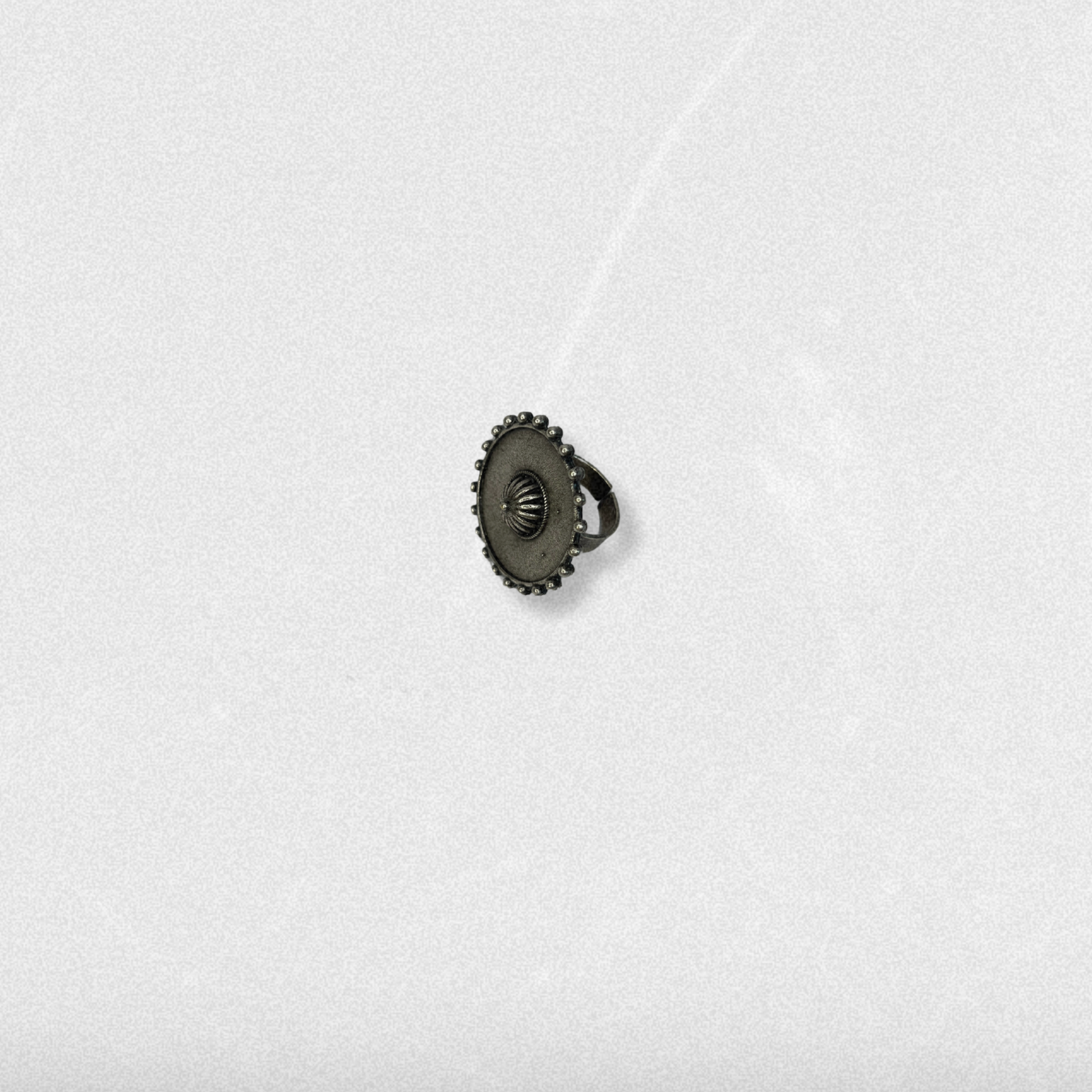 This regal oval ring is inspired by the ceremonial tilak thali—embellished with a central dome and bordered by oxidised beads. It’s a nod to ancestral rituals and royal grandeur, rooted deeply in Rajasthani heritage.