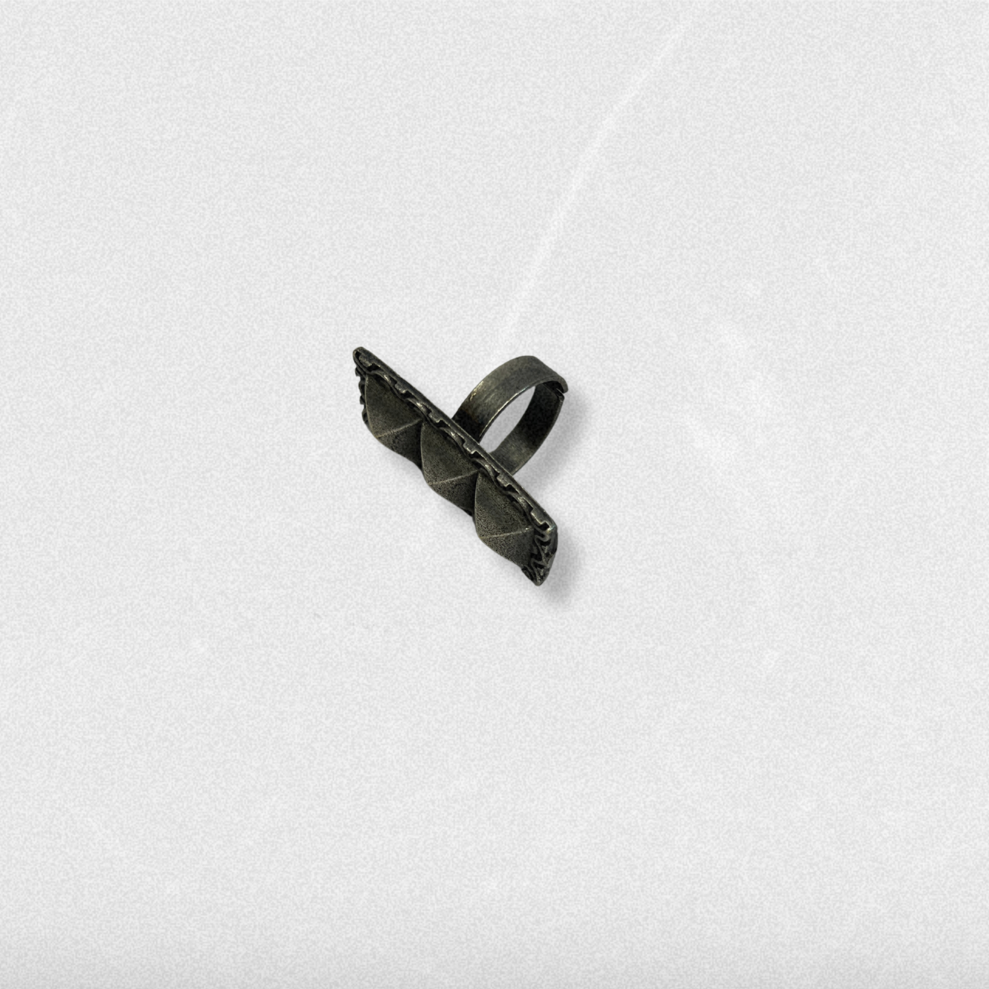 Minimal yet commanding, this oxidised statement ring features hand-carved grooves that echo the folds of tradition and timelessness. Inspired by architectural lintels from Rajasthan, this ring whispers quiet strength.