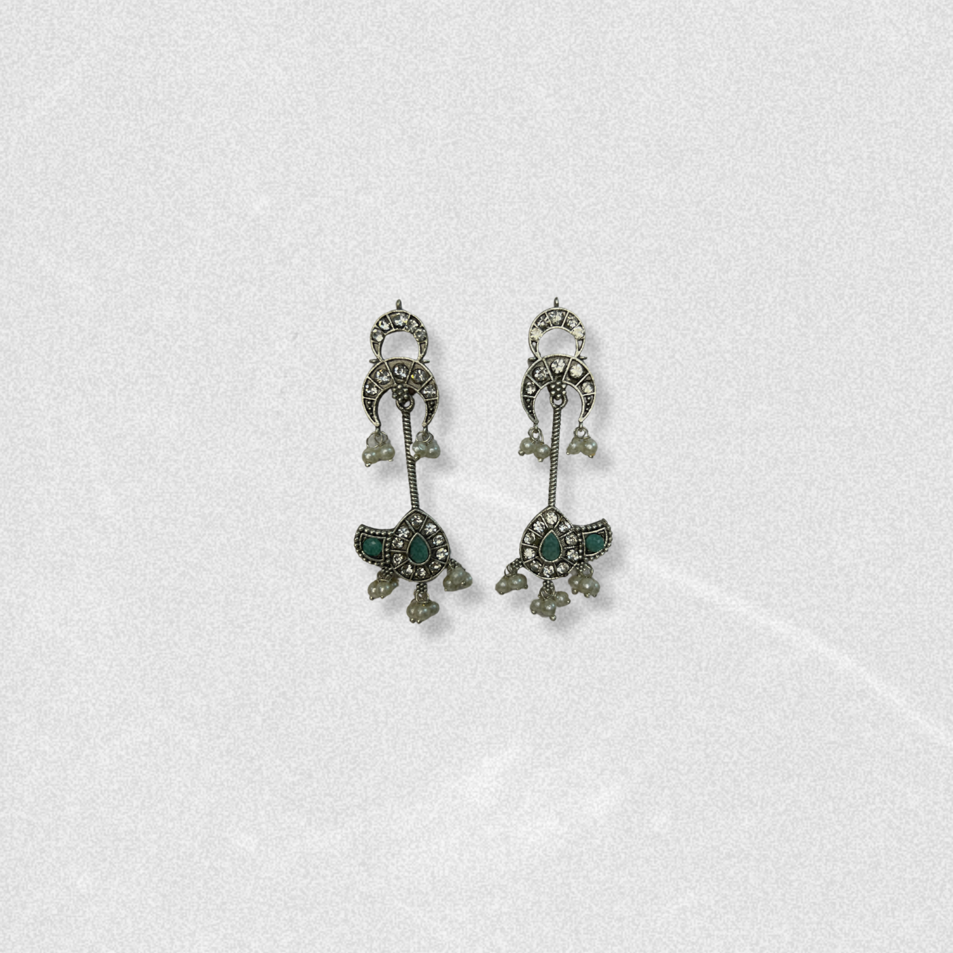 These silver oxidized danglers beautifully blend traditional and contemporary elements with their crescent motifs and intricate floral patterns. The green enamel work adds a pop of color, while the tiny cluster beads offer subtle movement, giving these earrings a graceful, ethnic charm. Perfect for festive occasions or elevating a casual Indo-western look.